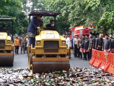 Metrobanten, Kota – Pemerintah Kota (Pemkot) Tangerang musnahkan sebanyak 8.268 botol Minuman Keras (Miras) berbagai merek serta 300 plastik dan lima drigen ciu saat peringatan Hari Ulang Tahun Ke-27 Kota Tangerang di kawasan Pusat Pemerintahan Kota Tangerang pada, Jumat (28/2/2020) pagi.
