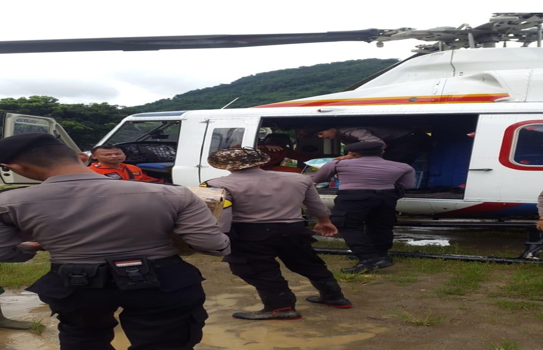 Dalam pendsitribusian tersebut, Dirpolairud Polda Banten Kombes Pol Nunung Syaefuddin melalui Kasubdit Fasharkan didampingi Iptu Ferdo personil Polres Lebak dan Crew Helly Bell 412 mendistribusikan bantuan logistik ke daerah terisolir bencana banjir di wilayah Lebak – Banten.