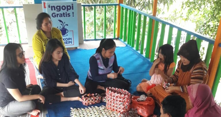Romi menjelaskan, kali ini mahasiswa datang untuk belajar menciptakan kreasi melalui sampah. Anak-anak mahasiwa ini sangat antusias dan menghasilkan tas serta tempat tisue dari plastik kopi.