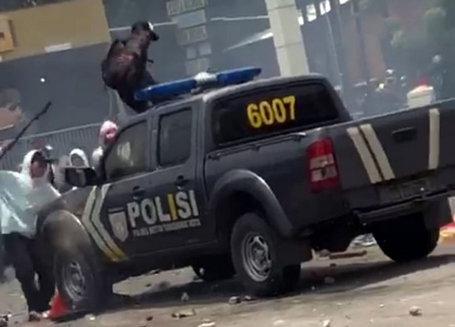 Sedangkan tersangka MS lanjutnya, menendang lampu sign depan sebelah kiri mobil patroli Sabhara, tersangka S naik ke atap lalu menginjak-injak mobil patroli. Sementara tersangka MI menendang pintu sebelah kiri mobil patroli Shabara.