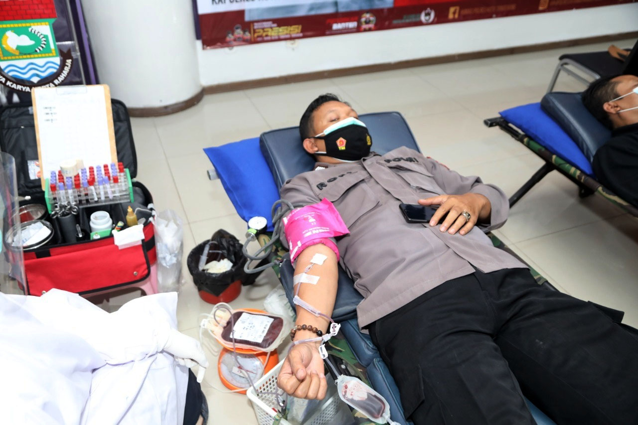 Metrobanten, Tangerang – Jajaran Polresta Tangerang Polda Banten melaksanakan kegiatan donor plasma konvalesen dan donor darah konvensional di Gedung Serba Guna (GSG), Puspemkab Tangerang, Kamis (18/2/2021).
