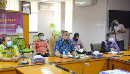Bupati sendiri melakukan vidcon di Ruang Cituis Lt. 5 Gedung Setda dan didampingi oleh Sekda, para Asisten, Kadiskominfo, Kadinkes, Kaban Bapenda, Kadis Koperasi, Kepala BPBD, dan Kaban BPKAD.