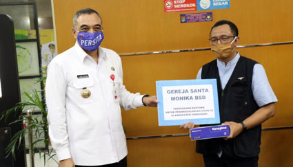 Adapun bantuan berupa peti mati datang dari Gereja Katolik Santa Monica BSD City Tangerang. Bantuan diserahkan kepada Dinas Perumahan, Permukiman dan Pemakaman (DPPP) Kabupaten Tangerang berupa 10 peti mati dan 50 baju hazmat sesuai standar protokol kesehatan Covid-19 yang dipergunakan untuk memakamkan jenazah korban terjangkit corona.