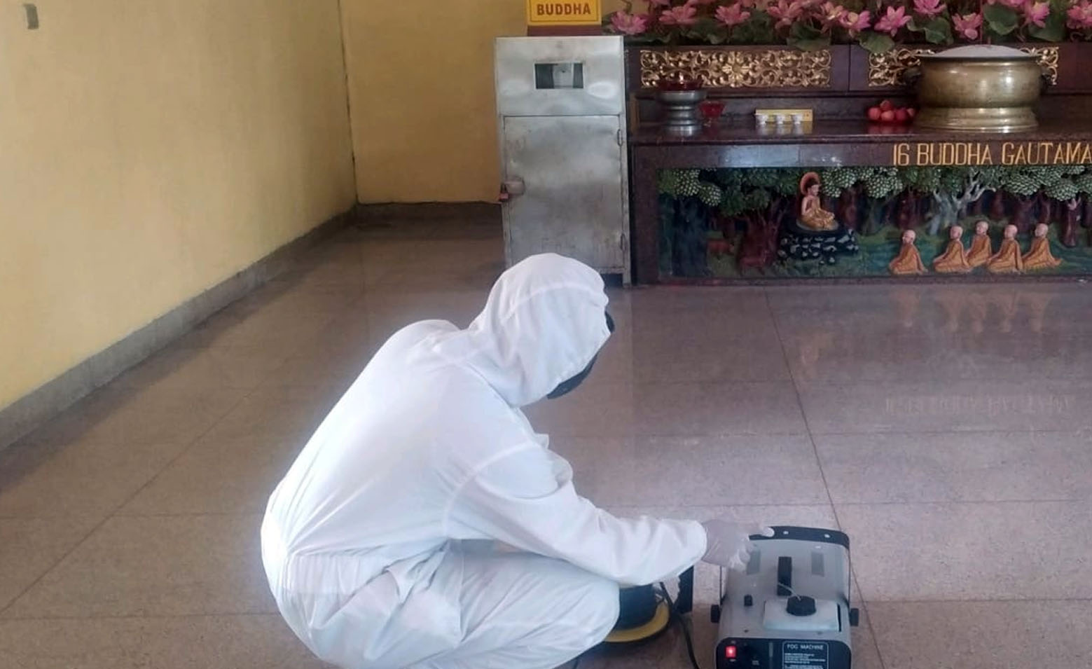 Cegah Covid-19, Brimob Polda Banten Semprotkan Disinfektan di Vihara Alokitesvara