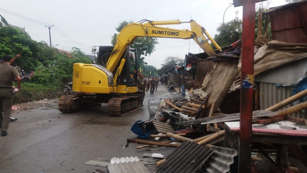 Metrobanten, Kota – Satuan Polisi Pamong Praja (Satpol PP) Kota Tangerang, tertibkan 38 bangunan kios yang berdiri di Jalan Irigasi Kali Sipon, Kelurahan Cipondoh, Kecamatan Cipondoh, Kota Tangerang, Rabu (30/01/19).