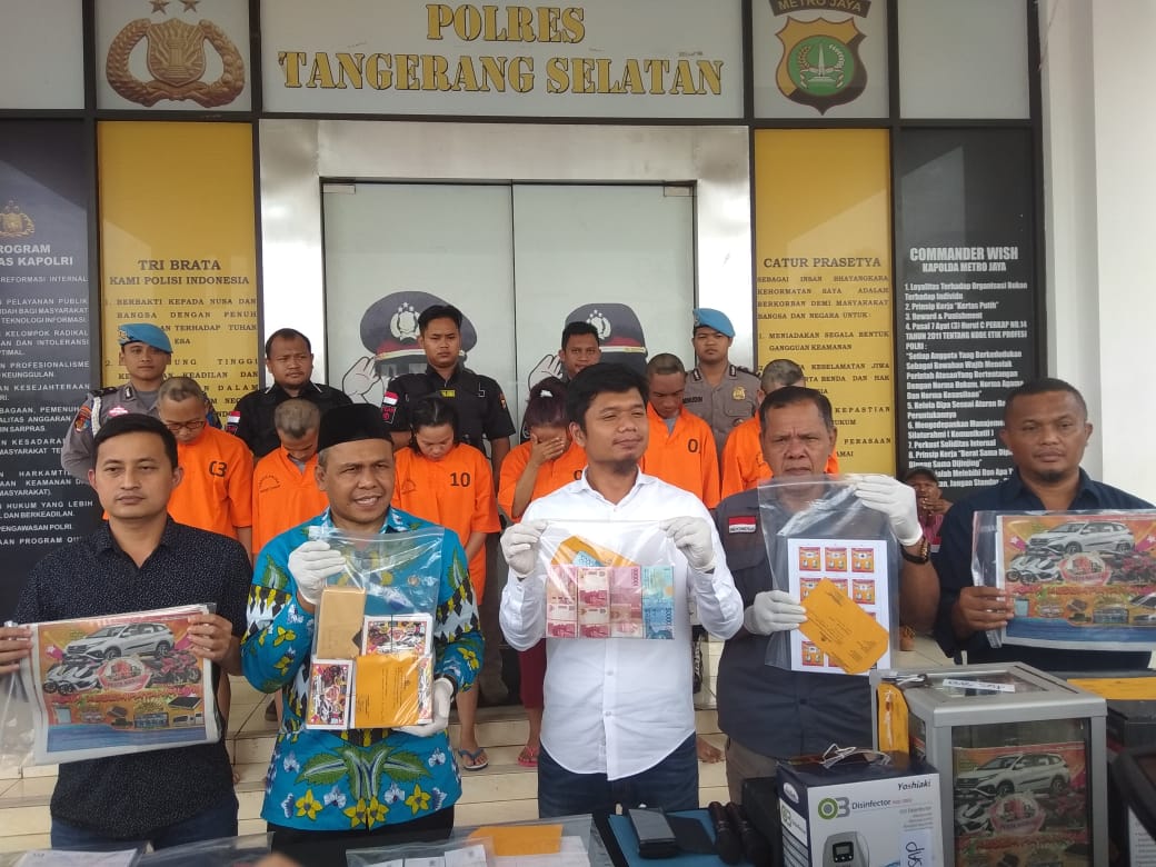 Atas kejadian tersebut, akhirnya, Polres Tangsel mengamankan keenam pelaku dengan barang bukti berupa uang tunai 14 juta, 1 kotak undian, 7 dokumen pemenang undian, 565 lembar kupon undian, 38 koran terbitan nasional, dan dokumen lainya.