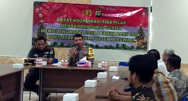 Metrobanten – Polsek Karawaci, Polres Metro Tangerang Kota, melaksanakan rapat koordinasi (rakor) tiga pilar Kecamatan Karawaci, bersama dengan pengurus gereja menjelang perayaan Natal 2023 dan Tahun Baru 2024 (Nataru).