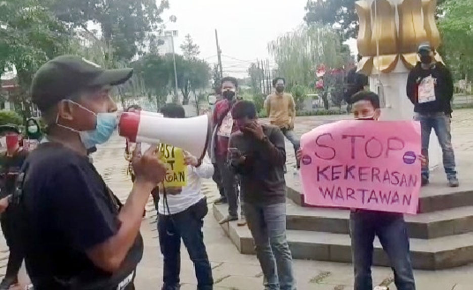 Massa aksi yang berasal dari berbagai media di Tangsel berkumpul menyuarakan aspirasinya menyusul atas adanya dugaan tindak intimidasi yang dilakukan oleh Kepala Dinas Pemuda dan Olahraga (Dispora) Tangsel, E. Wiwi Martawijaya terhadap seorang wartawan lokal setempat pada Selasa, 22 Juni 2021.