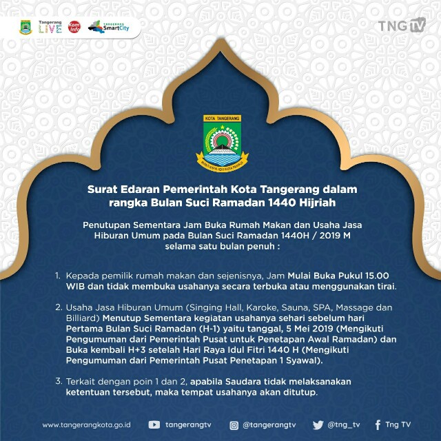 Metrobanten, Kota – Pemerintah Kota (Prmkot) Tangerang mengeluarkan surat edaran kepada seluruh pengusaha rumah makan dan tempat hiburan terkait Penutupan Sementara Jam Buka Rumah Makan dan Usaha Jasa Hiburan Umum pada Bulan Suci Ramadhan, Minggu (5/5/19).