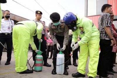 Metrobanten, Tangsel – Sejumlah petugas gabungan TNI Polri melakukan penyemprotan cairan disinfektan di sejumlah fasilitas umum di Stasiun Rawa Buntu, Kecamatan Serpong, Tangerang Selatan, Kamis (19/3/20).
