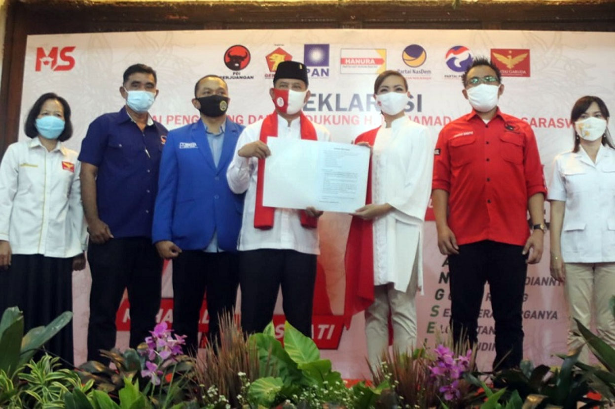 Deklarasi dukungan bagi pasangan Muhamad-Saraswati ini juga dihadiri Sekjen PDIP Hasto Kristiyanto dan Sekjen Gerindra Ahmad Muzani, beserta petinggi DPD partai koalisi di Resto Kampoeng Anggrek, Rawa Buntu, Tangerang Selatan.