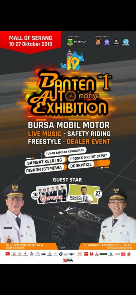 Metrobanten, Banten – Pemerintah Provinsi Banten melalui Badan Pendapatan Daerah (Bapenda) menutup rangkaian HUT 19 Provinsi Banten dan sebagai salah satu upaya dalam meningkatkan pendapatannya menggelar event “1st Banten Automotive Expo” yang bakal dilaksanakan pada 18 – 27 Oktober 2019 bertempat di Mall fo Serang (MoS), Kemang, Kota Serang, Banten.