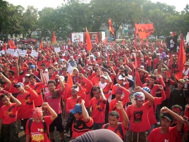 Tolak PHK, union busting dan kriminaliasi aktifis buruh. Laksanakan hak buruh perempuan dan lindungi buruh migran. Tangkap, adili dan penjarakan pengusaha nakal. Berlakukan jaminan sosial, bukan asuransi sosial.
