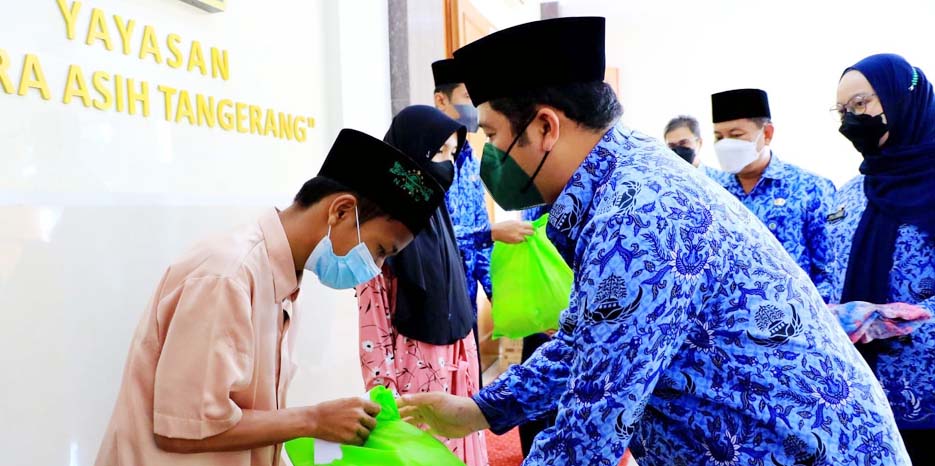 Wali Kota Tangerang Arief R. Wismansyah bersama Sekretaris Daerah Kota Tangerang Herman Suwarman serta beberapa kepala OPD Pemerintah Kota Tangerang memberikan santunan langsung kepada anak yatim di Yayasan Putra Asih Tangerang, Rabu (17/11/21).