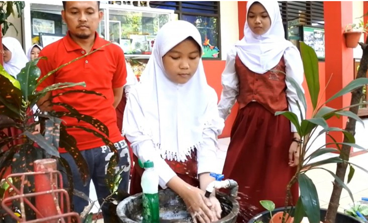 “Alhamdulillah di sekolah kami selama ini telah membiasakan para murid menerapkan PHBS, seperti cuci tangan dengan sabun, buang sampah pada tempatnya, pilah sampah,” jelas Kepala SDN Gondrong 4, Chustinawati.
