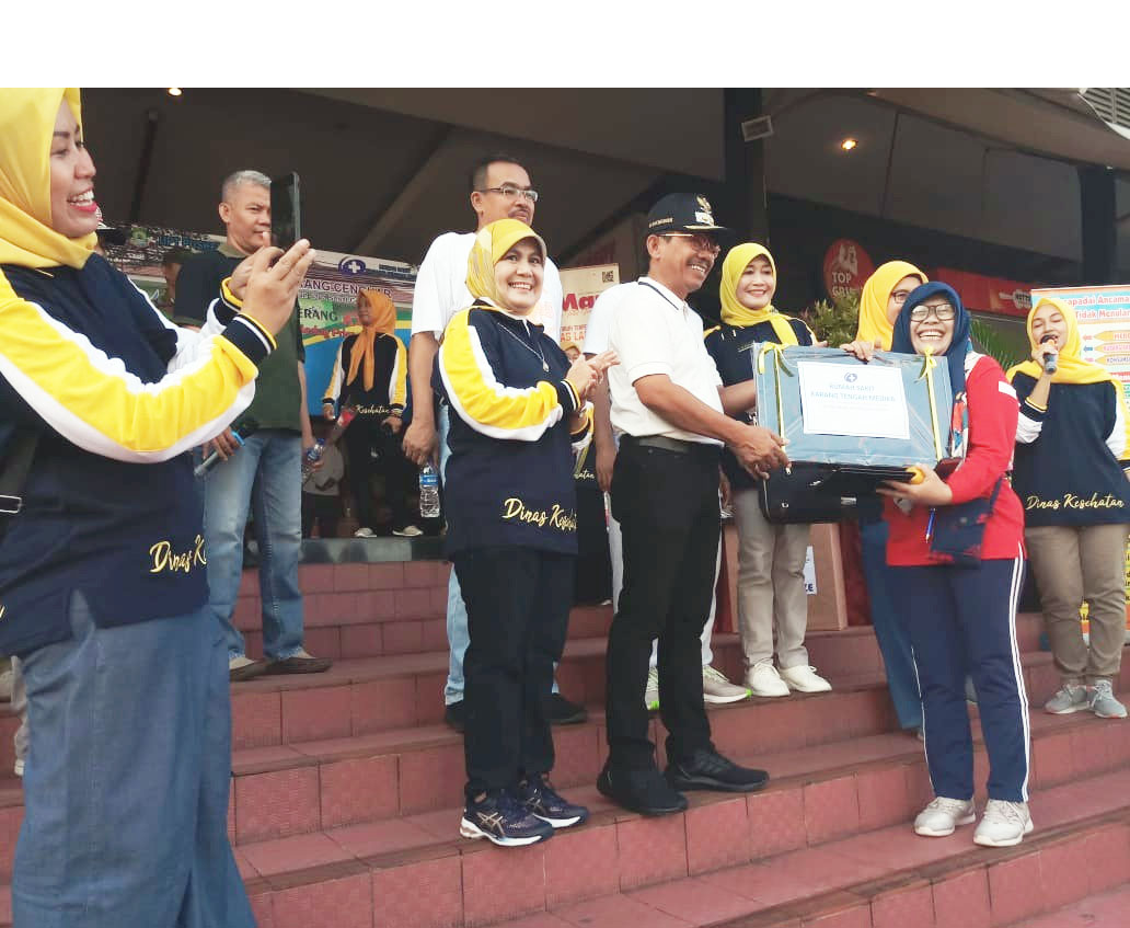 Usai senam bersama Dinkes membagi-bagikan makanan sehat berupa asupan buah-buahan dan membagikan hadiah, TV, Kompor gas, Rice Cooker, dan lainnya juga goodybag kepada masyarakat yang hadir.