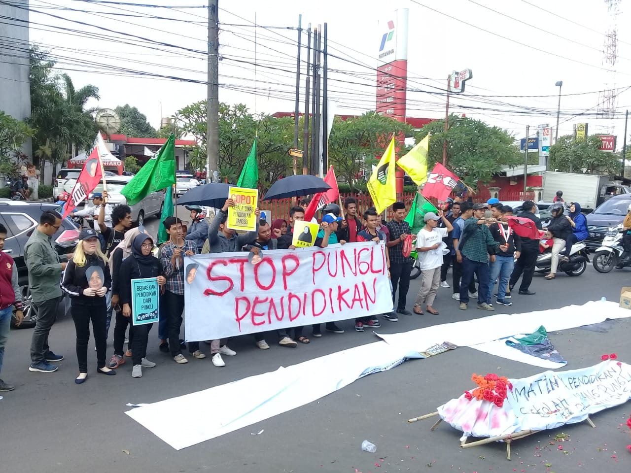 Dari pantauan awak media dilapangan para mahasiswa membawa spanduk bertuliskan stop pungli pendidikan,dan poster yang mendesak pemerintah untuk mencopot kepala dinas pendidikan, serta replika keranda mayat dan bunga.